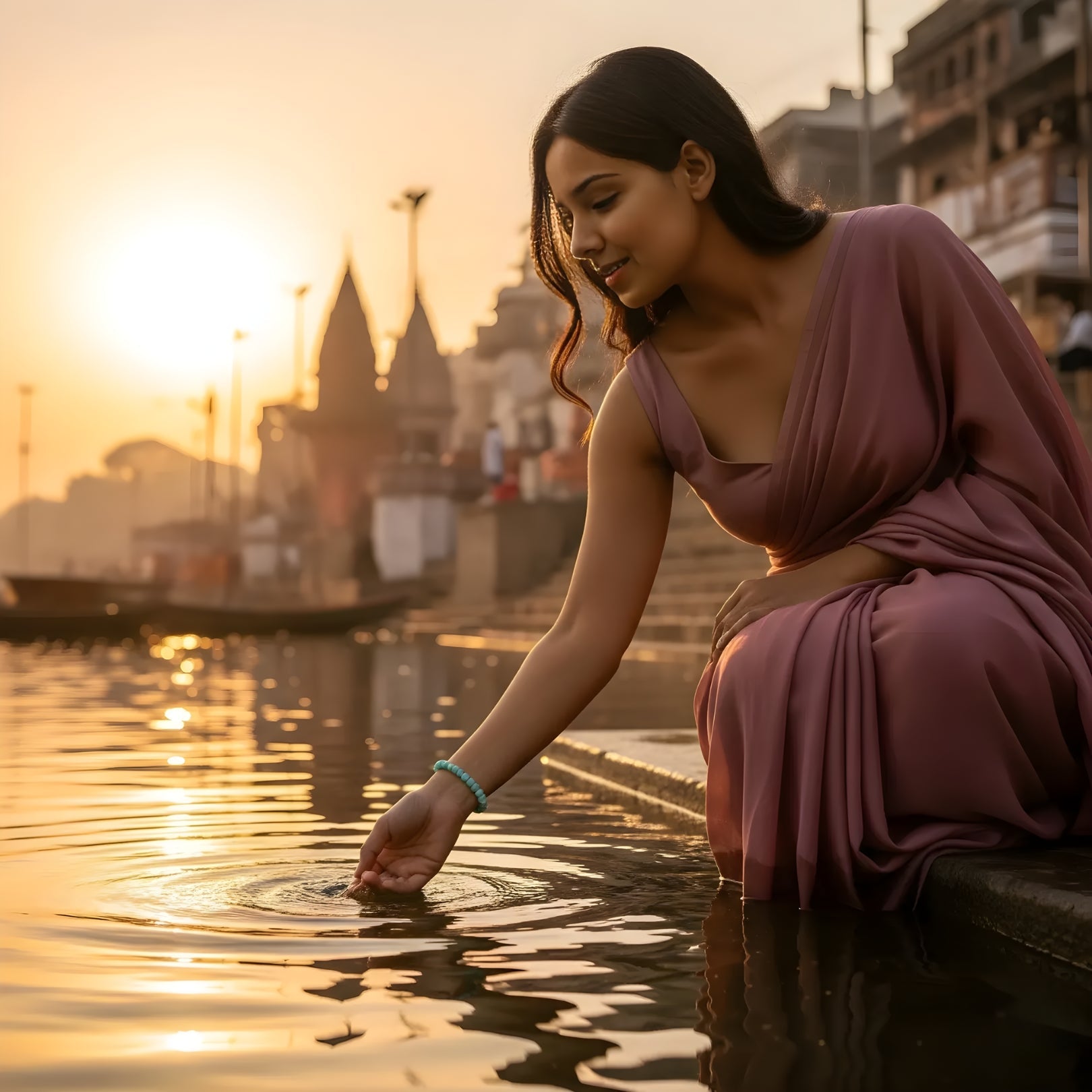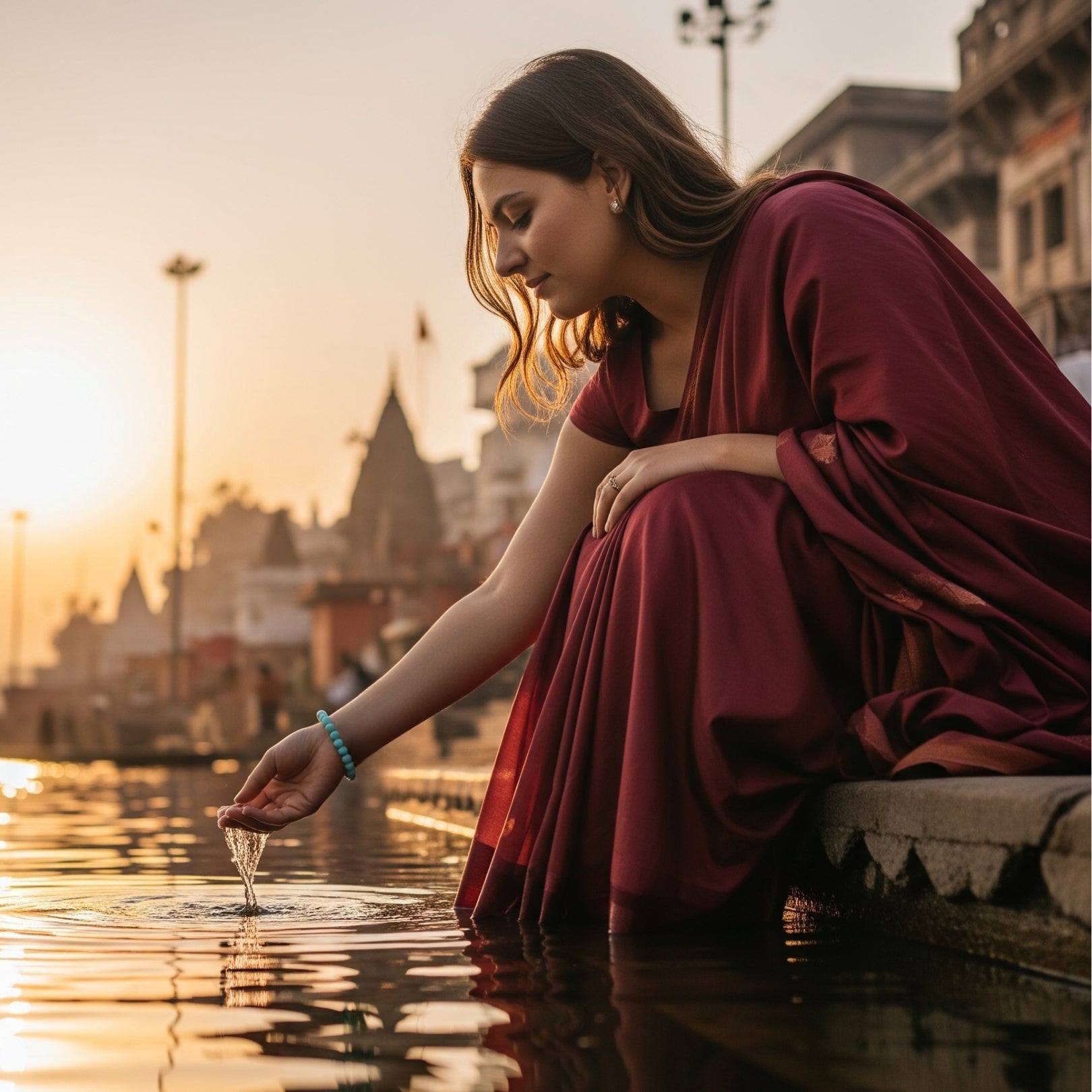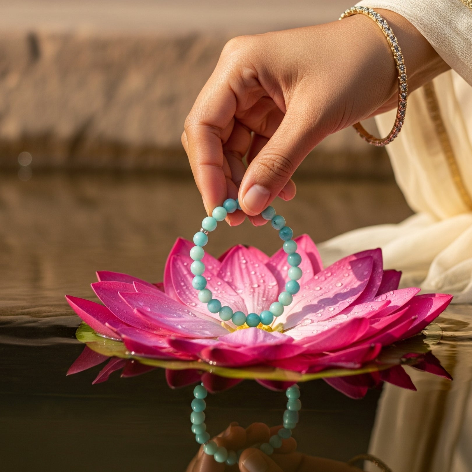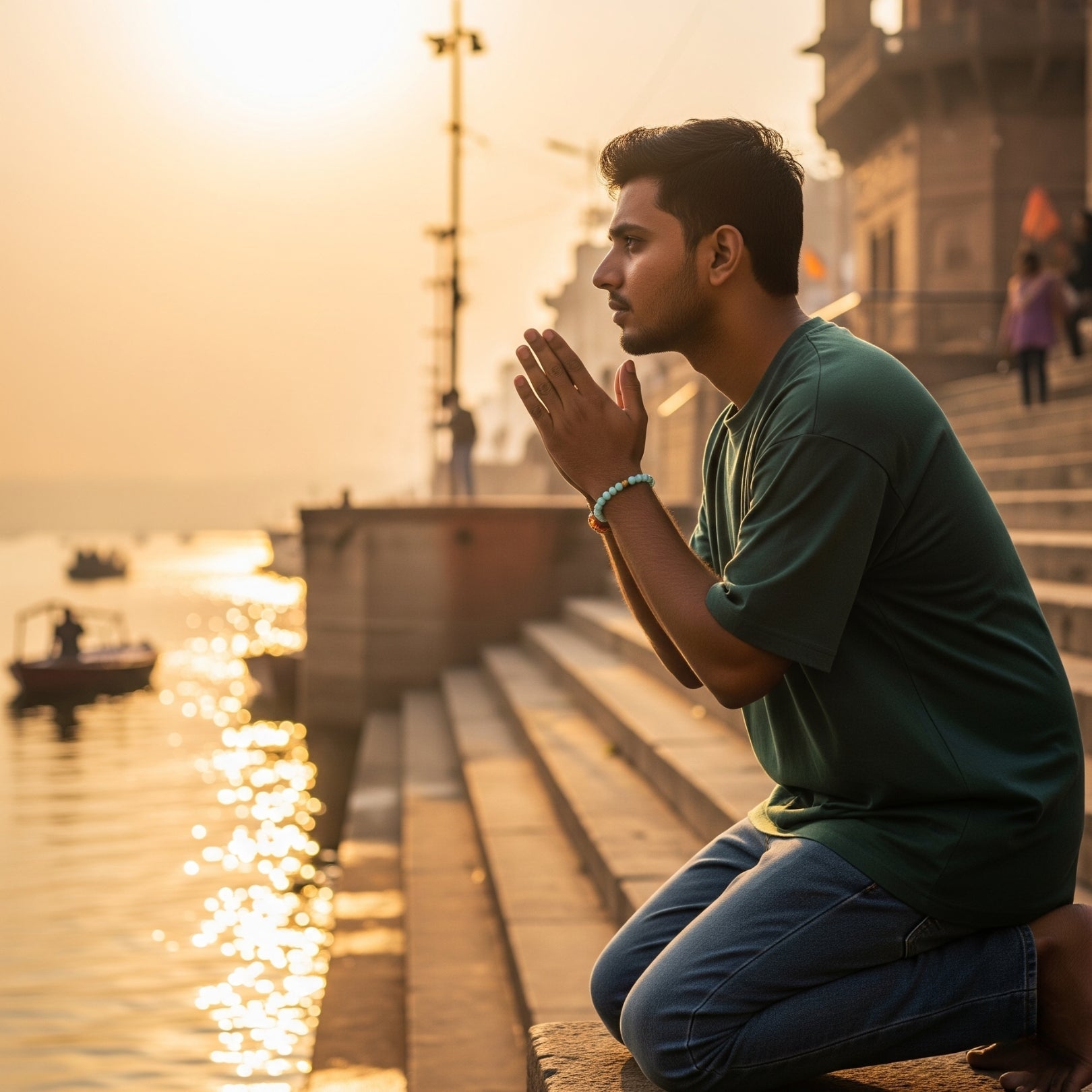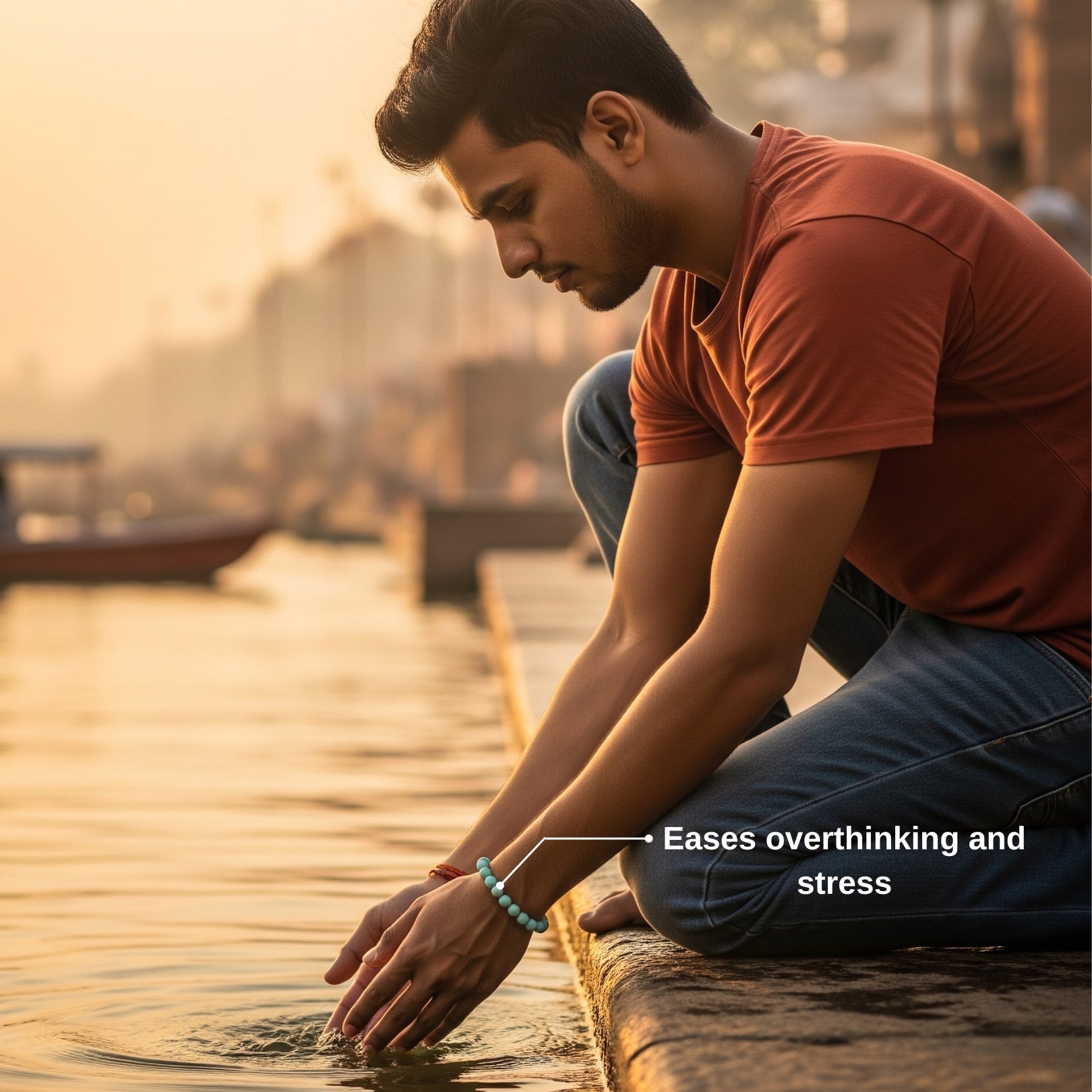 Immerse yourself in the serene essence of Varanasi with the Clarity Flow Bracelet, a aquamarine bracelet sanctified by the tranquil flow of the Ganga at Assi Ghat. This sacred ghat, where the Ganges River meets the vibrant spiritual heart of Kashi, evokes peace and calmness. This bracelet carries Kashi’s tranquil energy, guiding the wearer through emotional turbulence.