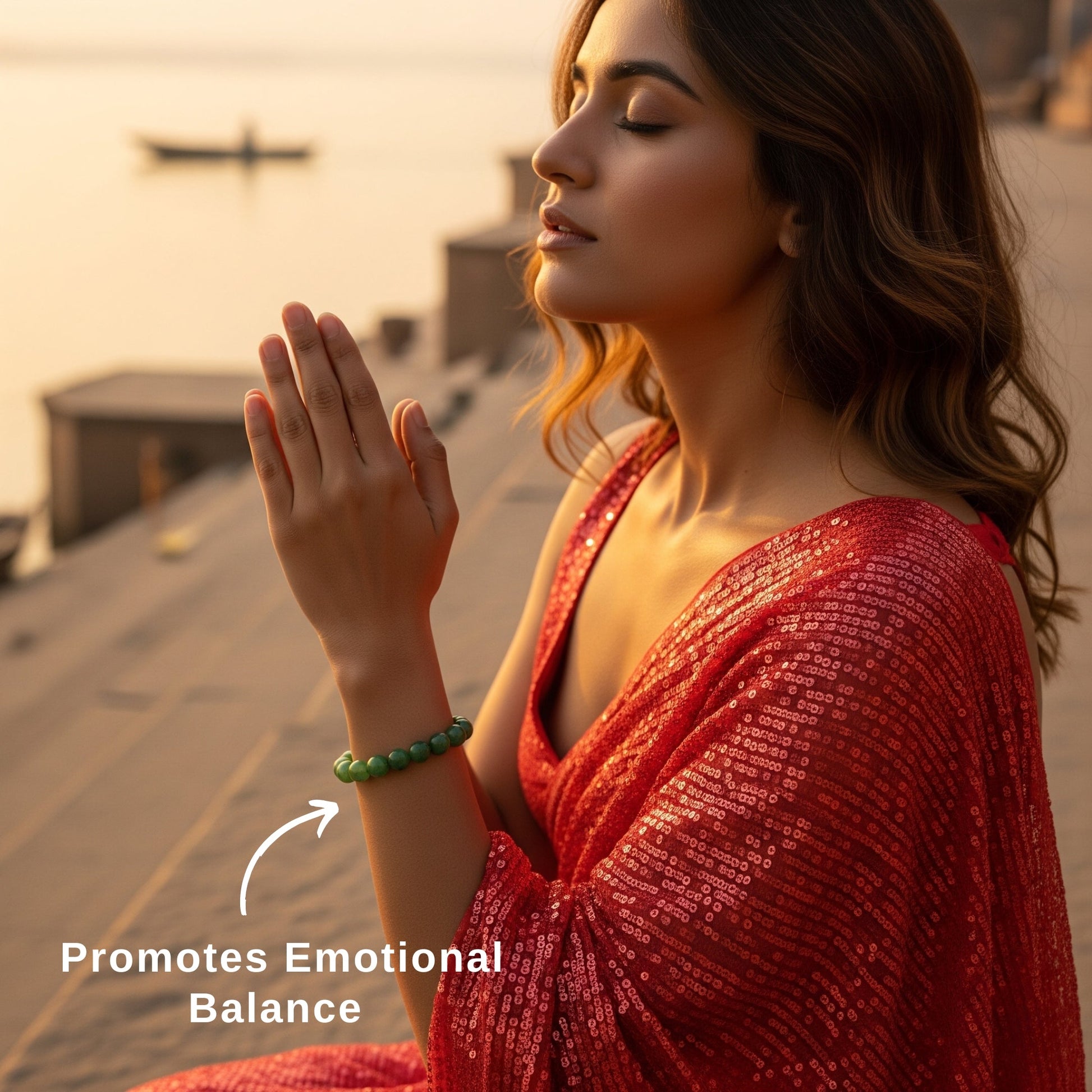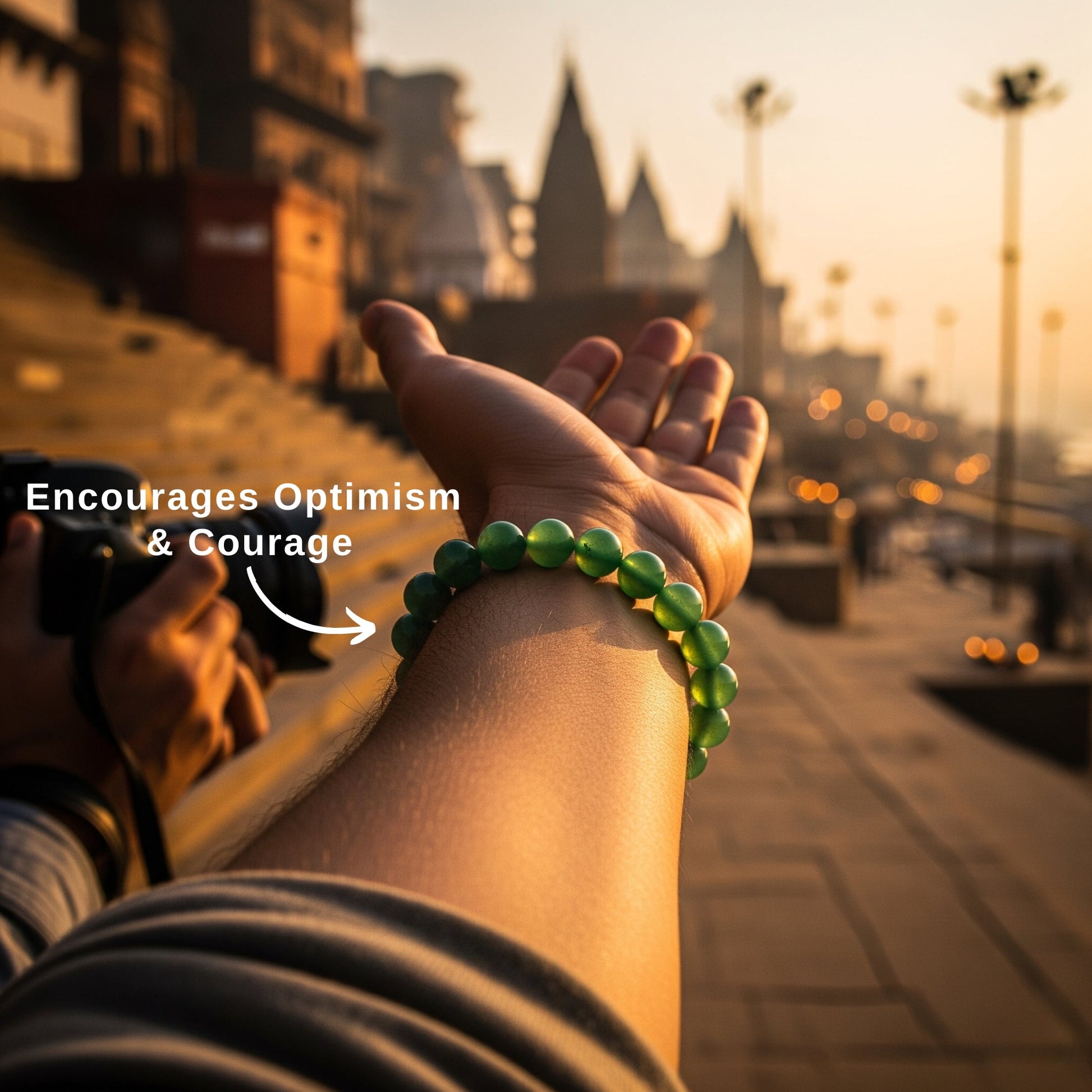 Step into abundance and serenity with the Emerald Flow Green Aventurine Bracelet. Skillfully crafted from luminous, polished aventurine beads, this bracelet embodies the vibrant energy of growth, luck, and emotional well-being. Revered as the “Stone of Opportunity,” this bracelet brings the cooling touch of Kashi’s spiritual love to your everyday life.