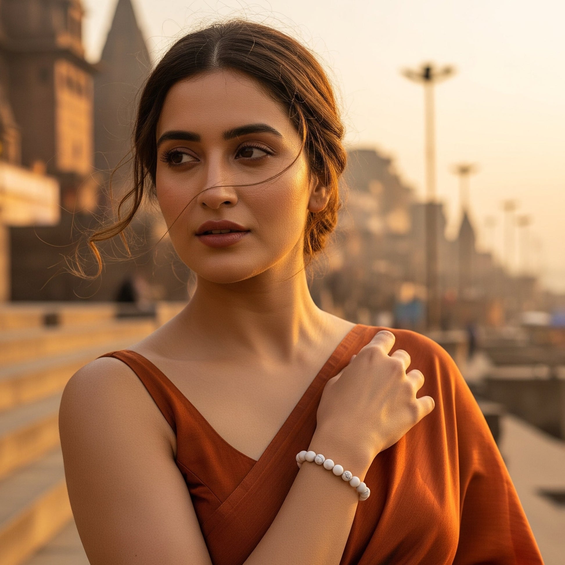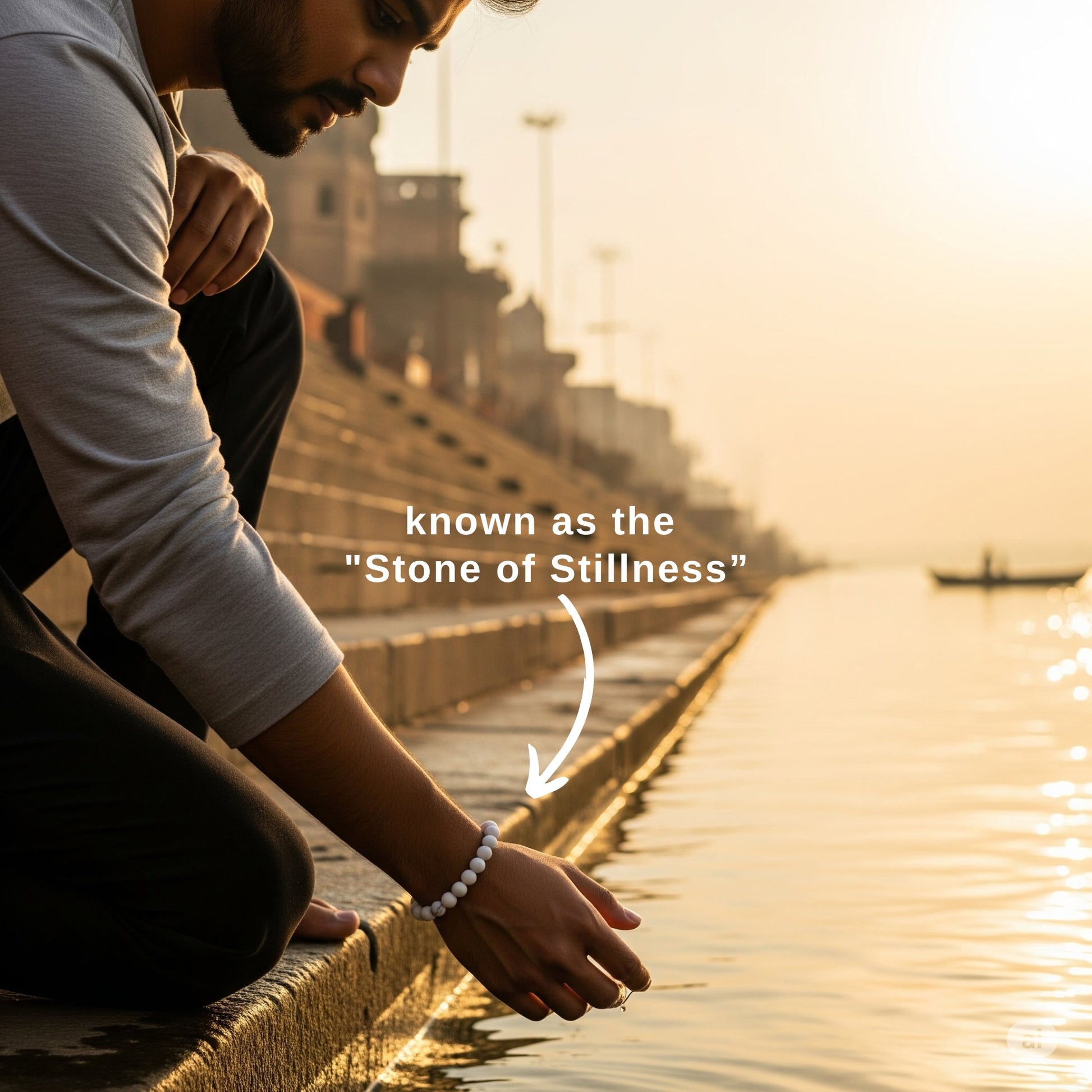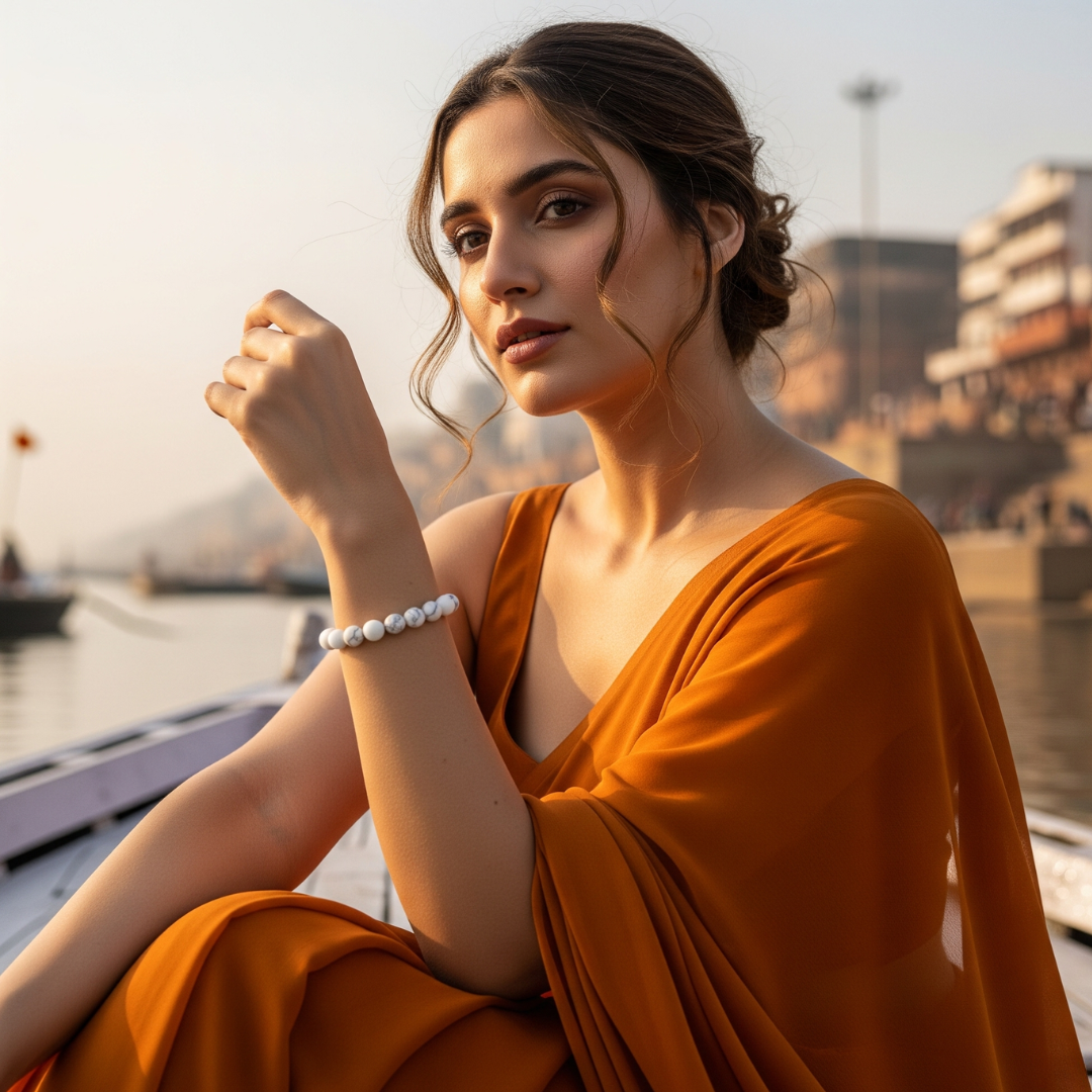 Bring home the serenity of Kashi with the Midnight Ganga Bracelet, crafted from natural White Howlite beads. Known as the "Stone of Stillness," White Howlite is cherished for its powerful calming energy, helping you slow down, center your thoughts, and reconnect with your higher self.