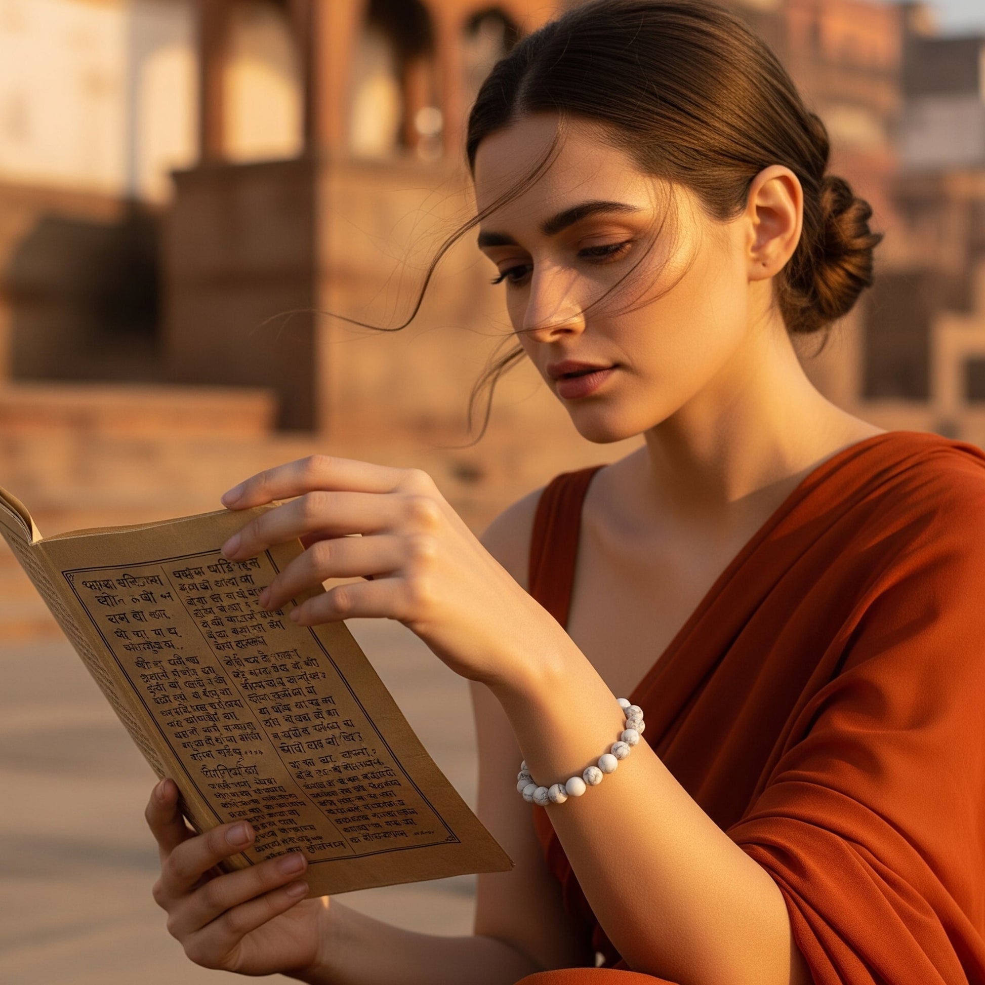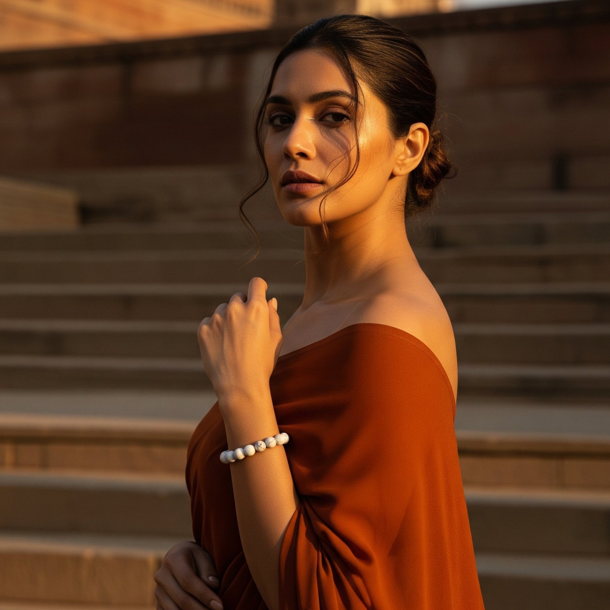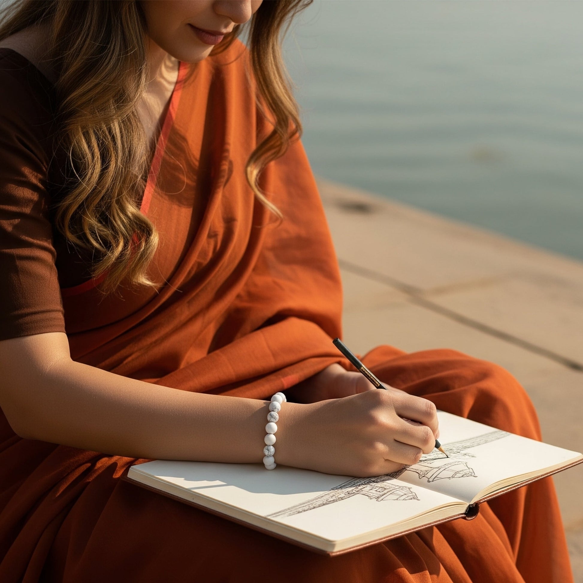 Bring home the serenity of Kashi with the Midnight Ganga Bracelet, crafted from natural White Howlite beads. Known as the "Stone of Stillness," White Howlite is cherished for its powerful calming energy, helping you slow down, center your thoughts, and reconnect with your higher self.