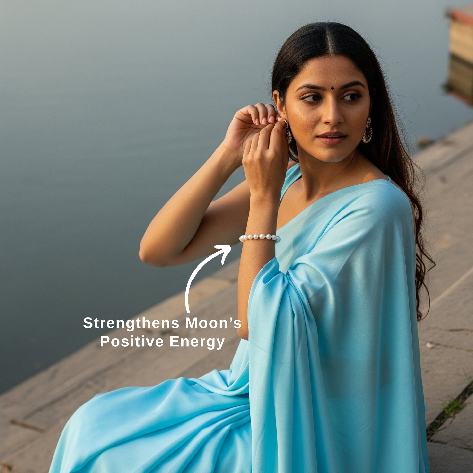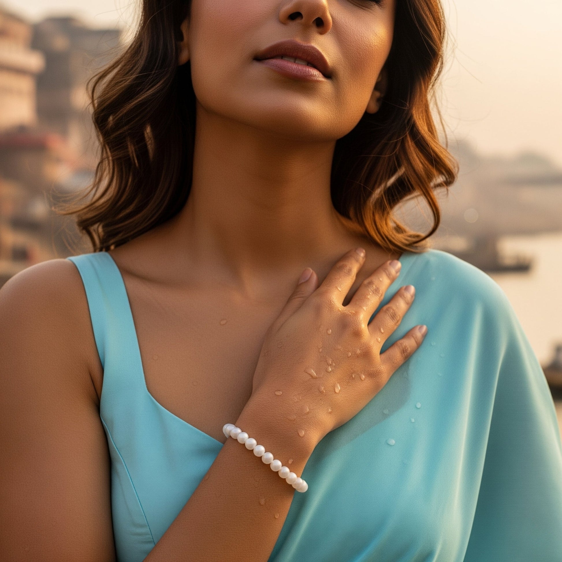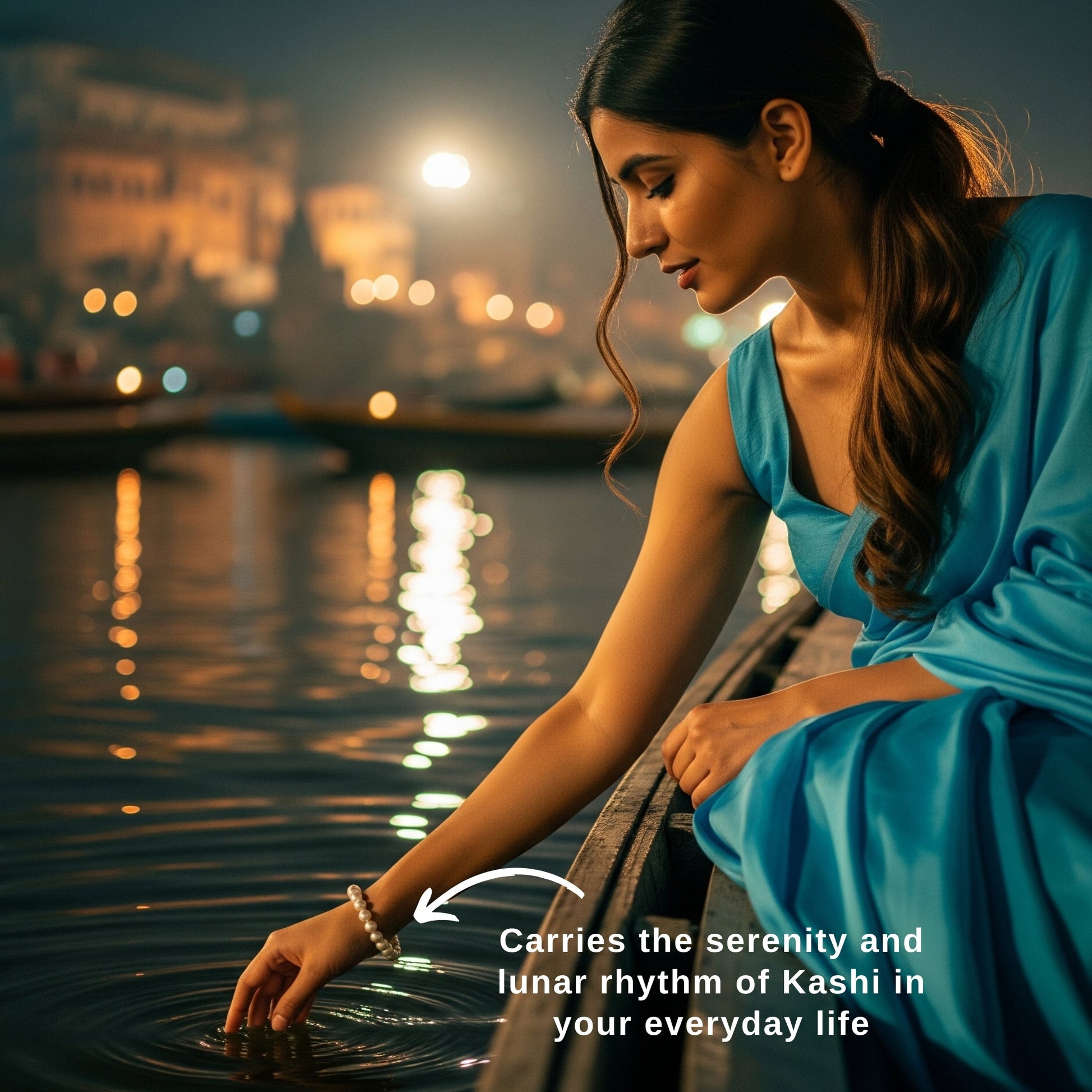 Wear the bracelet on your left wrist at dawn or moonrise on a Monday (Somvar)—the day ruled by Chandra (the Moon)—for maximum spiritual resonance. Quietly recite the simple mantra “Om Chandraya Namah” to synchronize your inner rhythms with both the lunar energy and Kashi’s enduring tranquilit