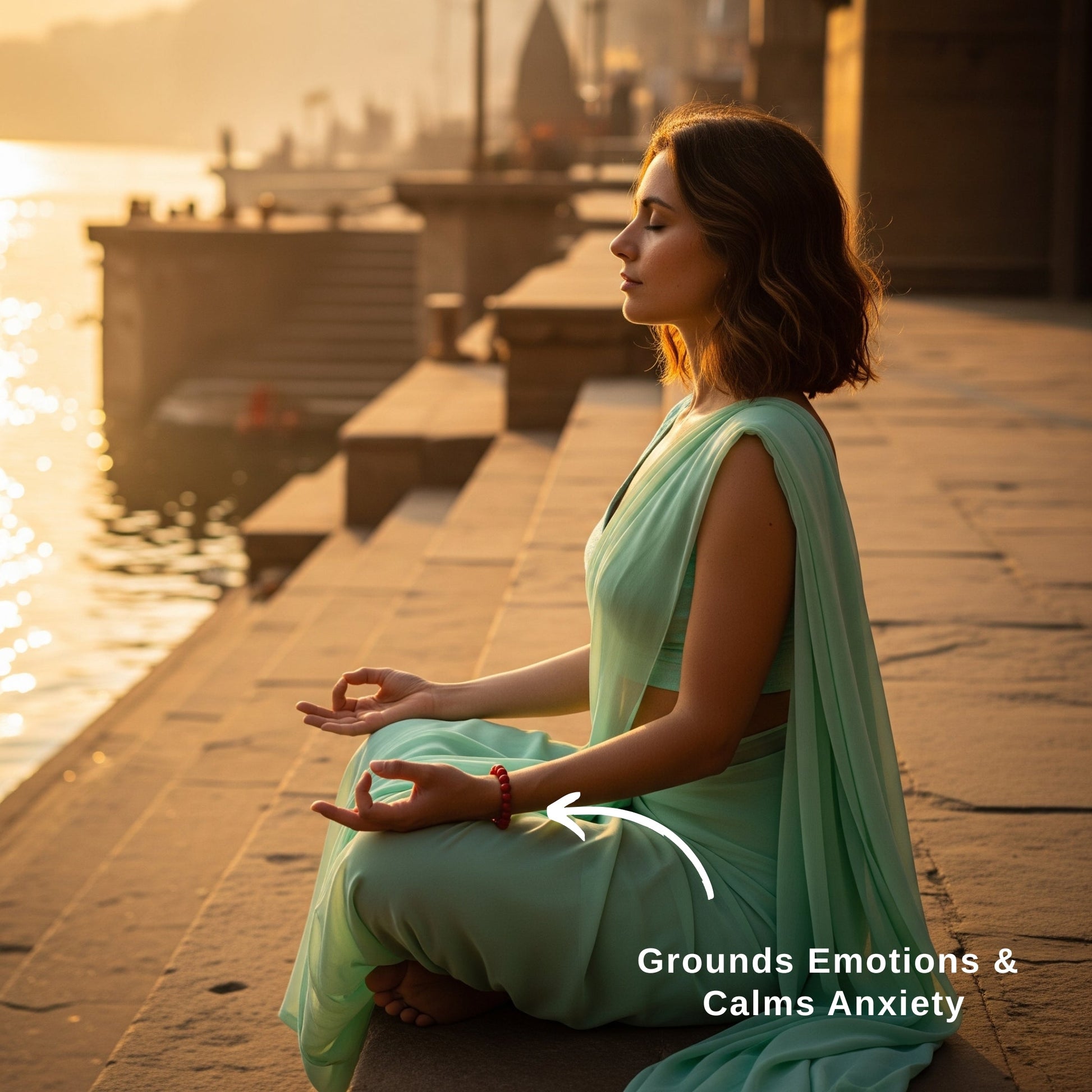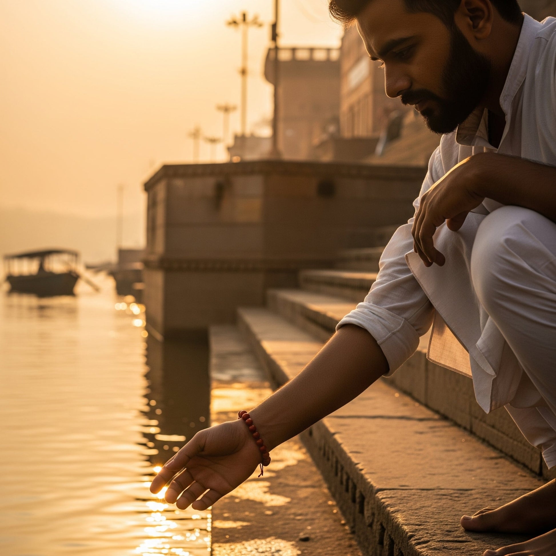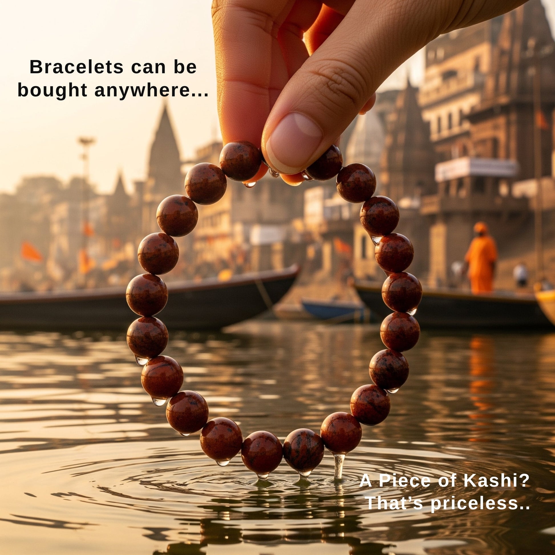 Revered as a guardian stone, it helps dispel negativity while the bracelet’s Ganga blessing weaves in Kashi’s protective spiritual current.