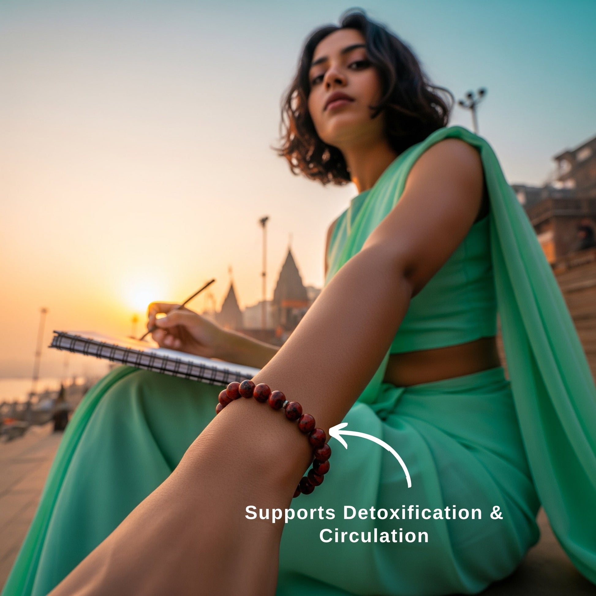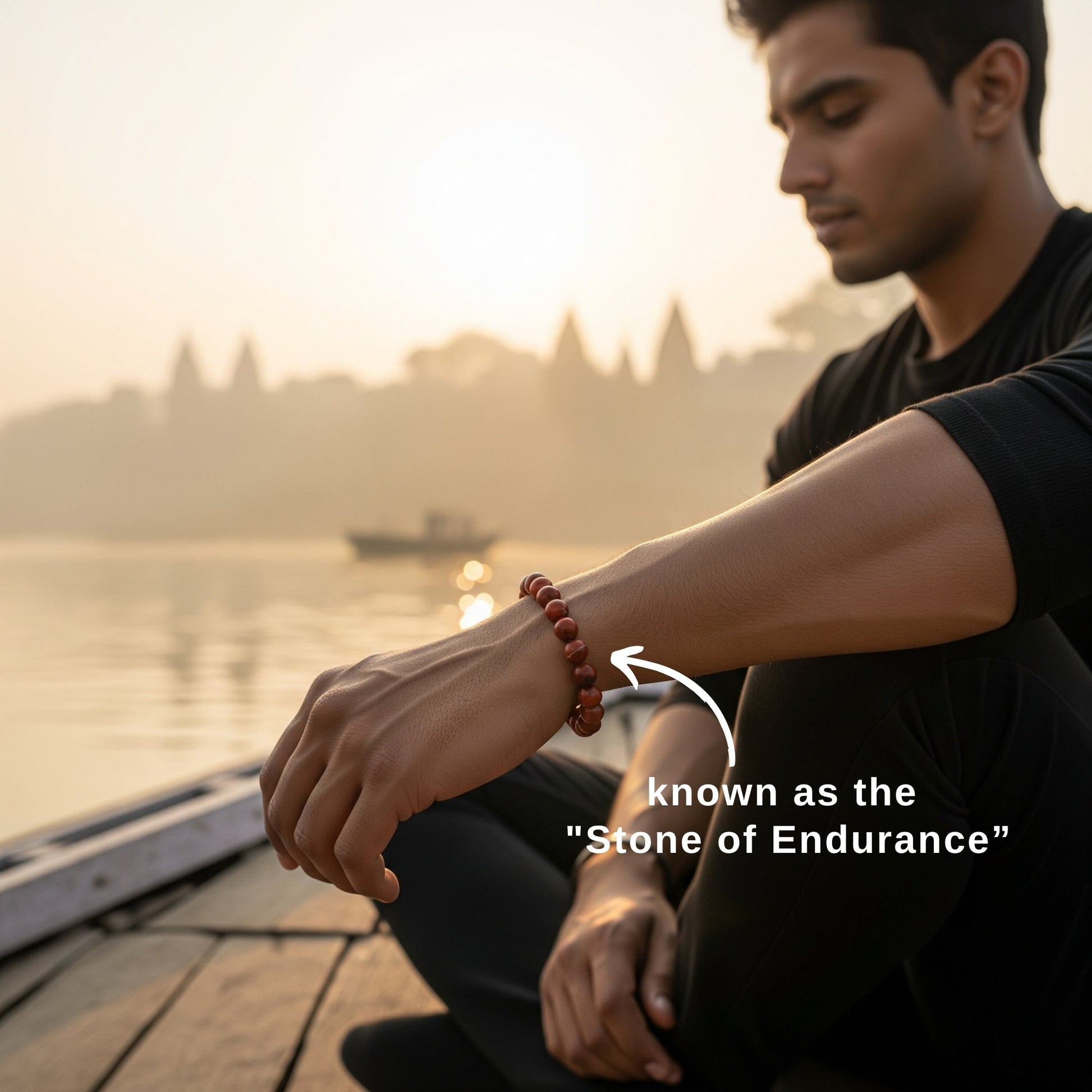 Infused with the fierce grace of Kashi’s Durga Kund temple, this Bracelet radiates the grounding strength of Red Jasper. Each bracelet is bathed in Ganga jal and blessed at Temple. Red Jasper is known in Vedic and yogic traditions as the "Stone of Endurance", anchoring the Root Chakra. It grounds your energy, stabilizes emotions, and invokes a quiet strength — the kind that grows from within.