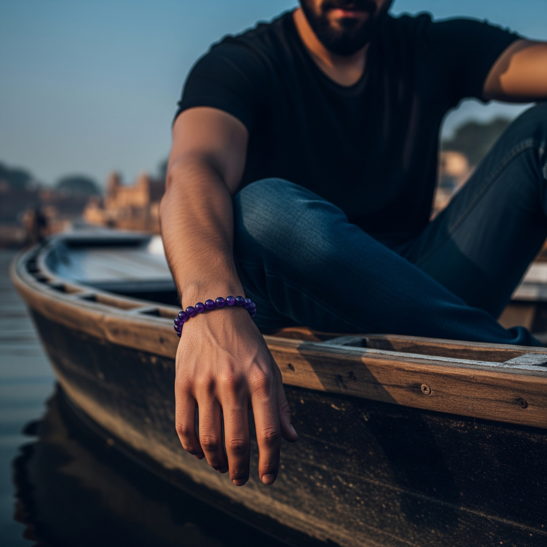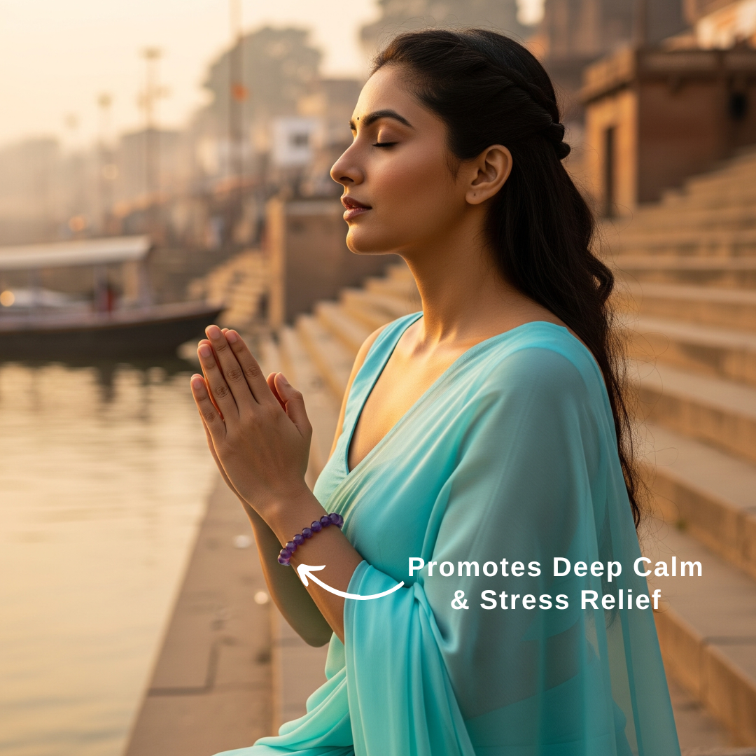 Step into a sanctuary of serenity with the TranquilAura Amethyst Bracelet. Drawing inspiration from the timeless riverbanks of Varanasi, each polished amethyst bead carries the gentle, grounding energy of Kashi's sacred ghats, ready to guide you toward calm and clarity throughout your day.