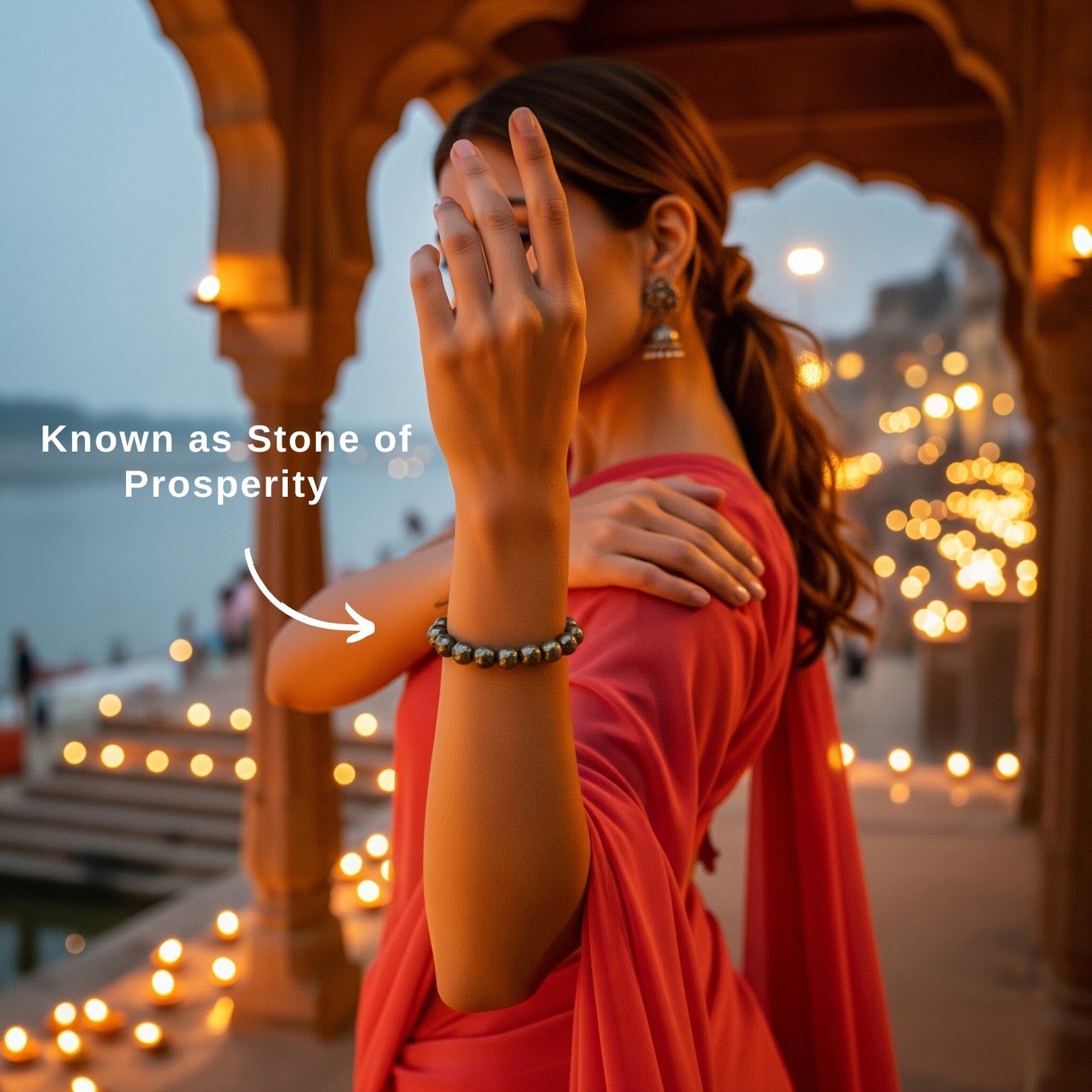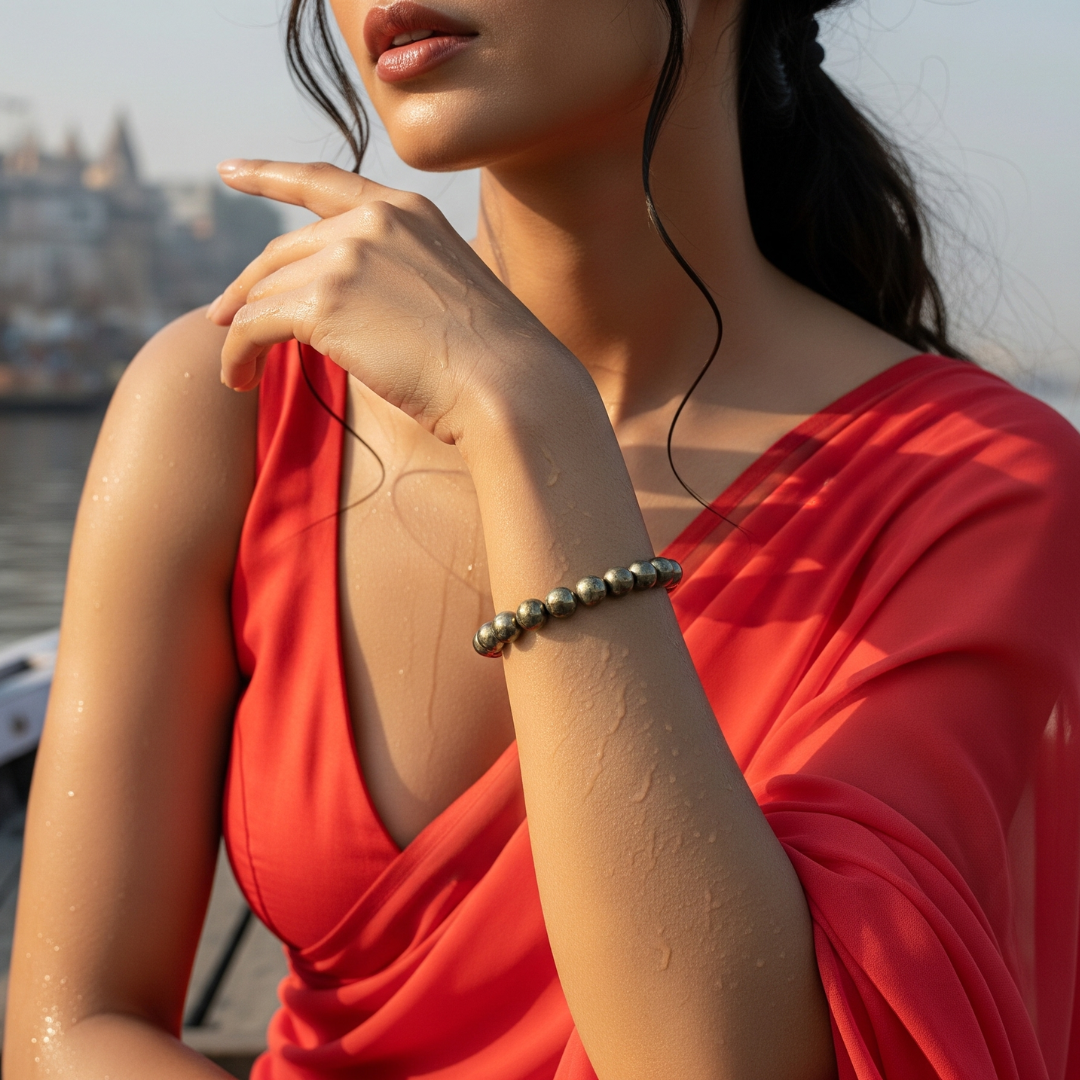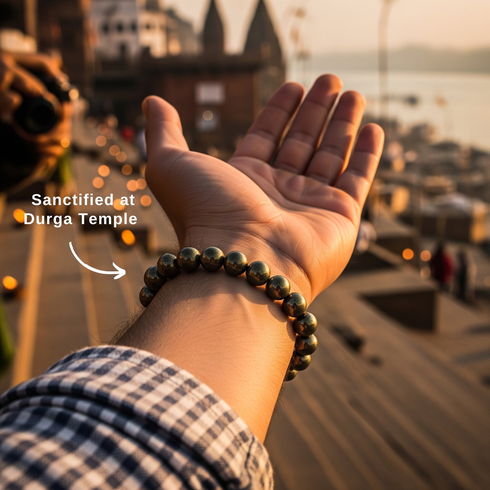 Empowered by the fierce energy of Kashi's sacred ghats, the Wealth Attractor Raw Pyrite Bracelet channels the primal fire of the sun and earth's golden treasures. Raw Pyrite acts as a powerful money magnet, drawing financial opportunities, career success, and unexpected abundance into your life. Its golden metallic luster mirrors the energy of prosperity, helping you manifest wealth through action and determination