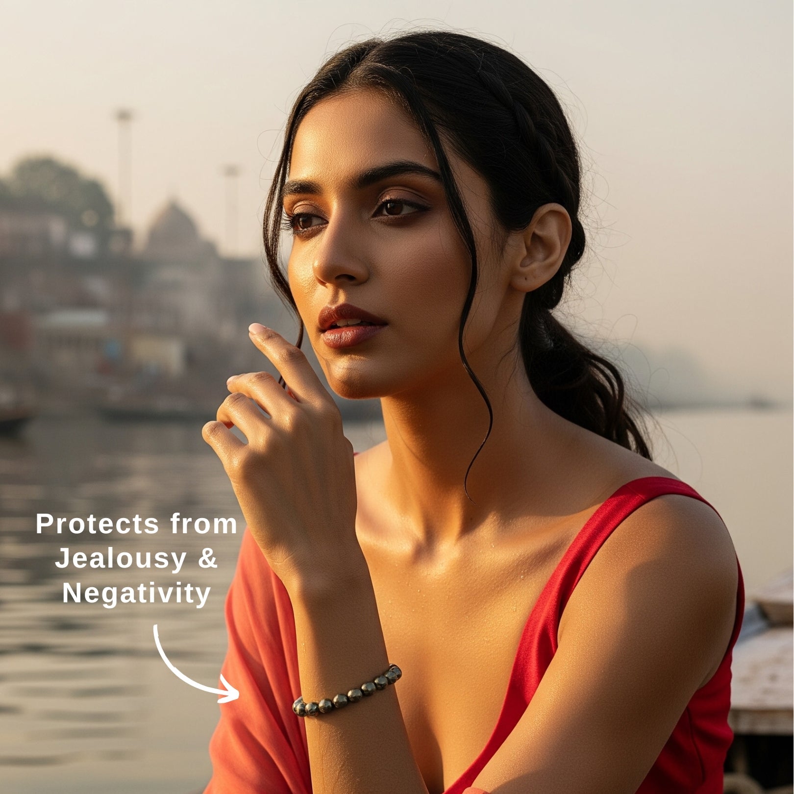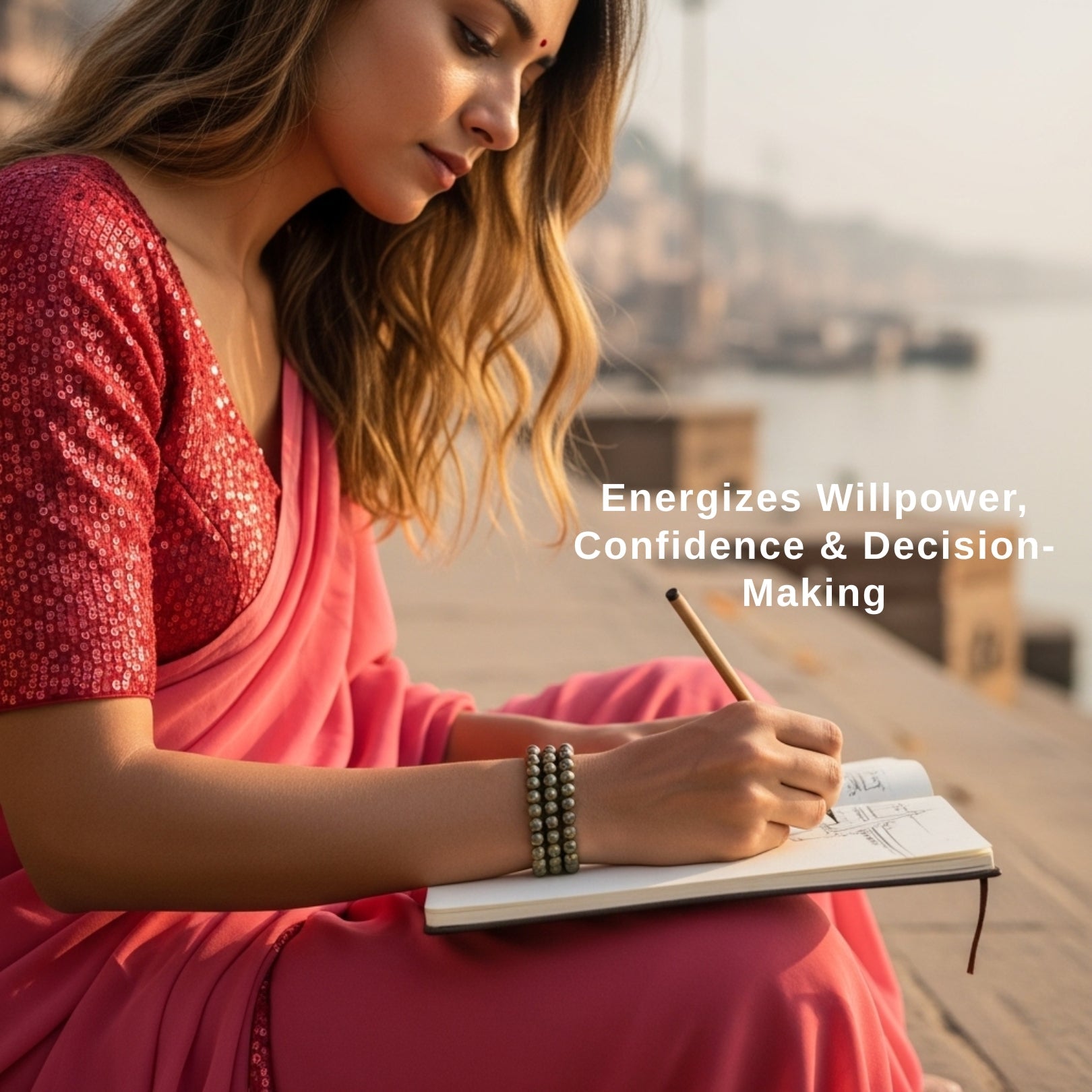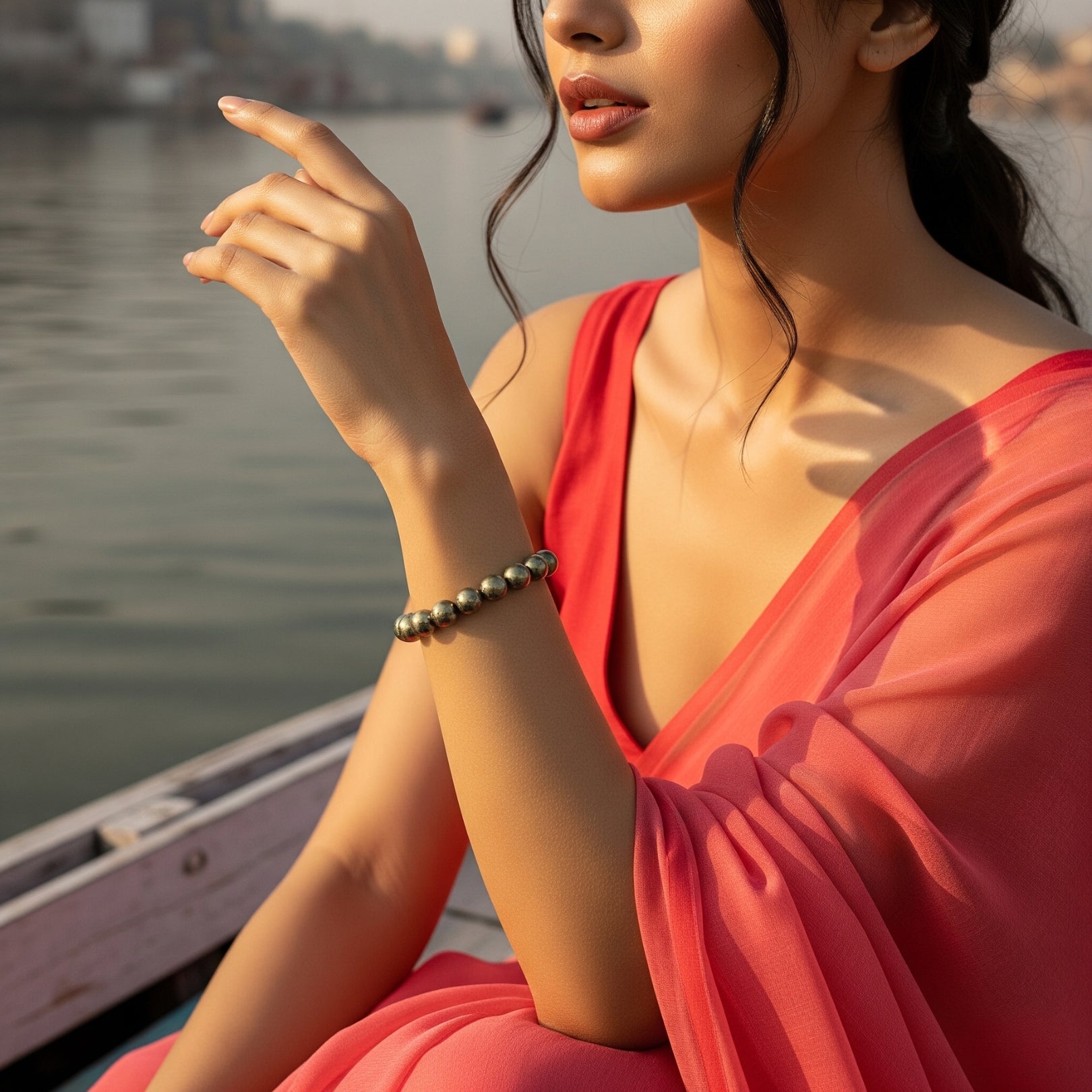 Empowered by the fierce energy of Kashi's sacred ghats, the Wealth Attractor Raw Pyrite Bracelet channels the primal fire of the sun and earth's golden treasures. Raw Pyrite acts as a powerful money magnet, drawing financial opportunities, career success, and unexpected abundance into your life. Its golden metallic luster mirrors the energy of prosperity, helping you manifest wealth through action and determination